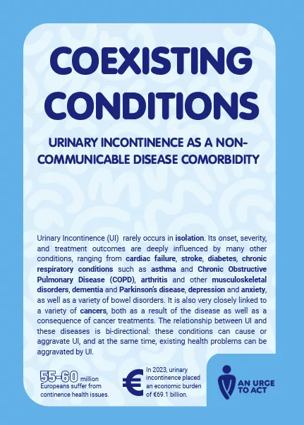 Following the calls from the Manifesto, the Urge to Act campaign aims at demonstrating that UI is not an isolated condition. Living with an NCD, with UI as a comorbidity just makes the life of patients harder. By acknowledging the connection and eliminating the taboo, conversations between patients and doctors will be easier, and the shame around UI will slightly disappear.