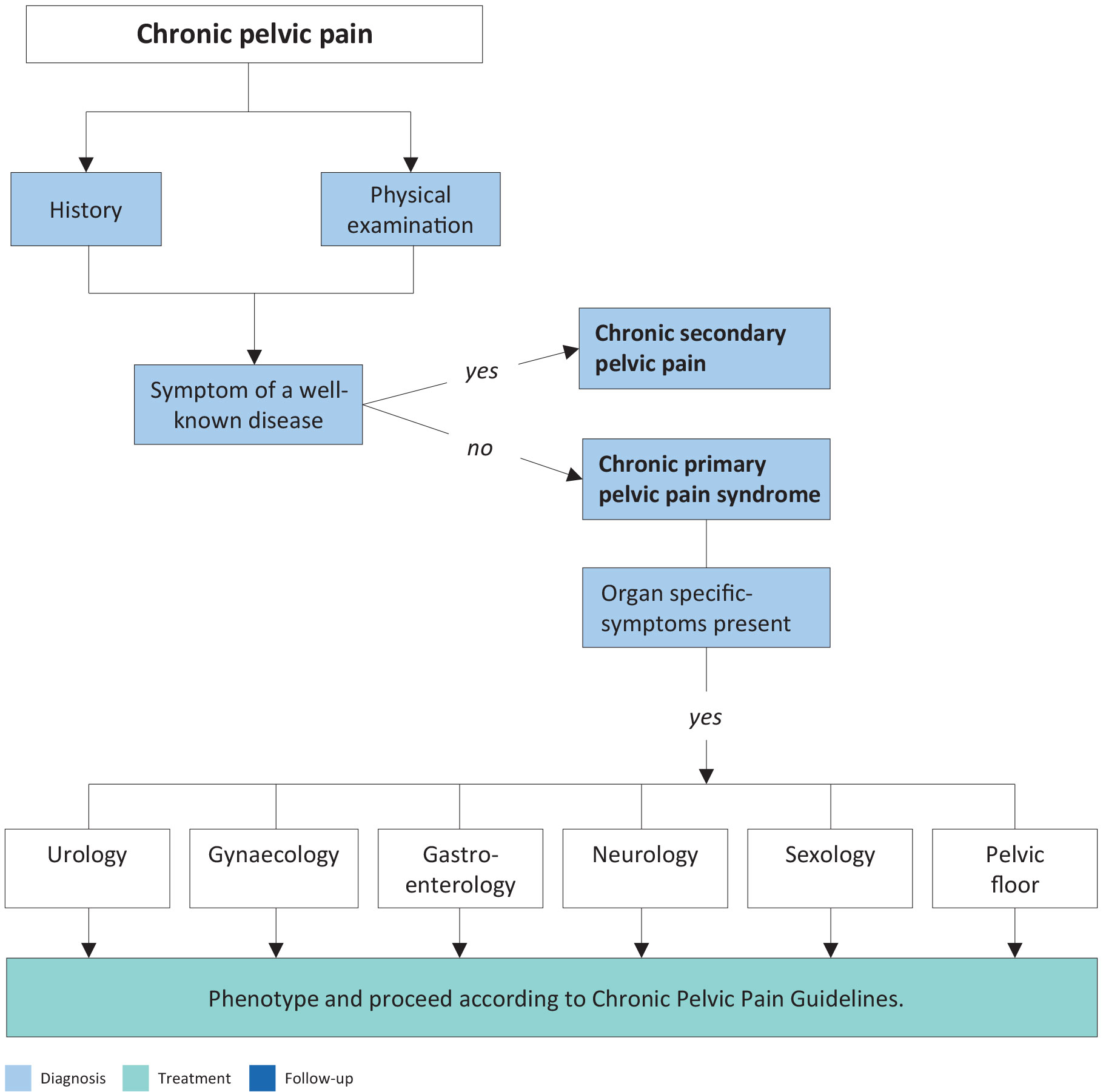 History is very important for the evaluation of patients with chronic pelvic pain. Pain syndromes are symptomatic diagnoses, which are derived from a history of pain perceived in the region of the pelvis and absence of other pathology for a minimum of three months. This implies that specific disease-associated pelvic pain caused by bacterial infection, cancer, drug-induced pathology (e.g. ketamine use) [234], primary anatomical or functional disease of the pelvic organs, and neurogenic disease must be ruled out.