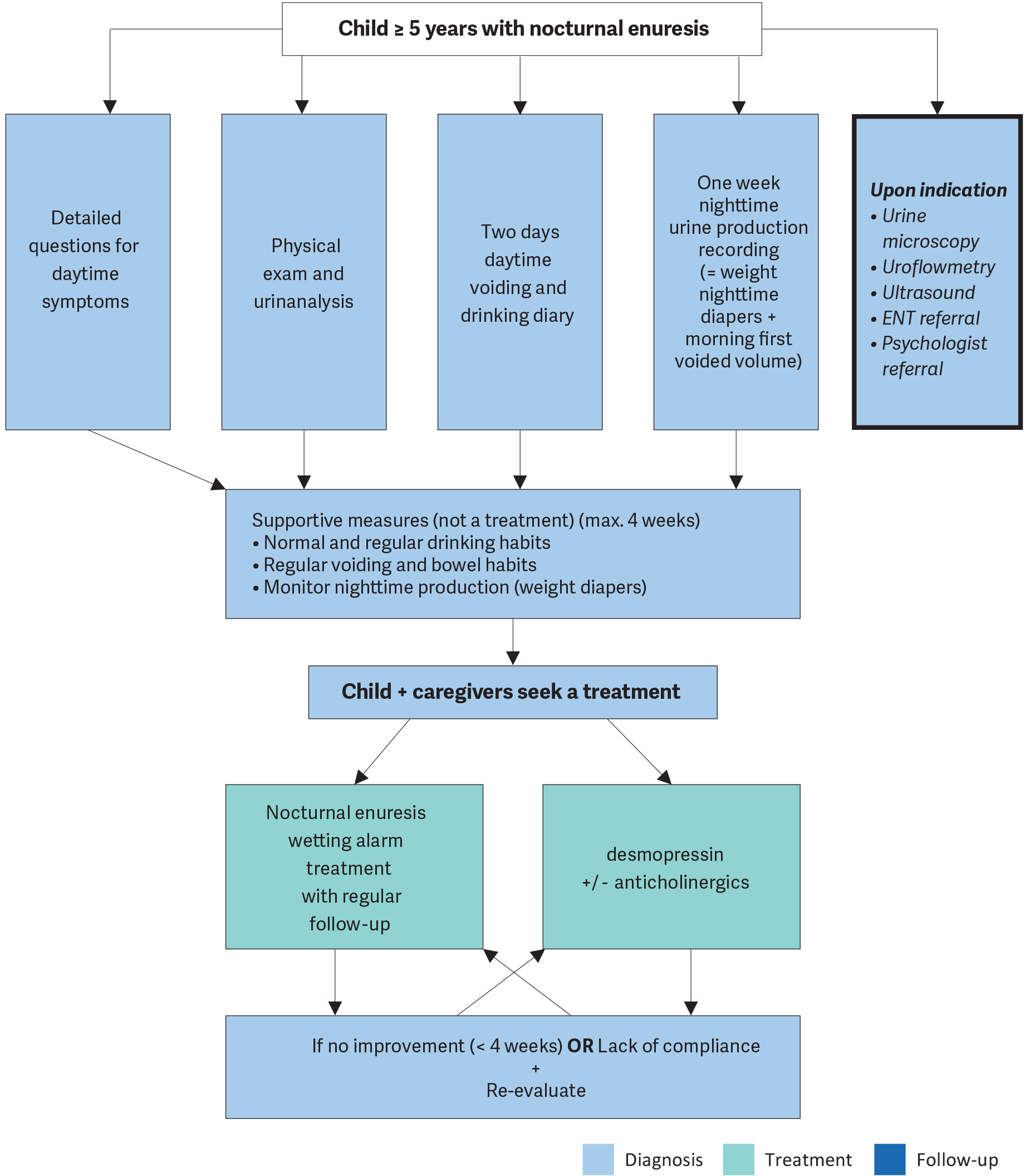 The diagnosis is mainly obtained by history-taking. Focused questions to differentiate monosymptomatic versus non-monosymptomatic, primary versus secondary, comorbid factors, such as behavioural or psychological problems and sleep disorder breathing, should be asked. In addition, a two-day complete micturition and drinking diary, which records daytime bladder function and drinking habits, will further exclude comorbid factors such as LUTS and polydipsia [741].