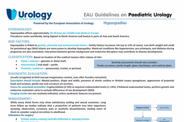 This Cheat Sheet outlines key points on hypospadias: epidemiology, risk factors, classification, diagnostic evaluation, and management. It includes surgical indications, timing, pre-operative therapy, and techniques. It highlights complication rates, outcomes by severity, and the importance of long-term follow-up for function, appearance, and psychosexual well-being.