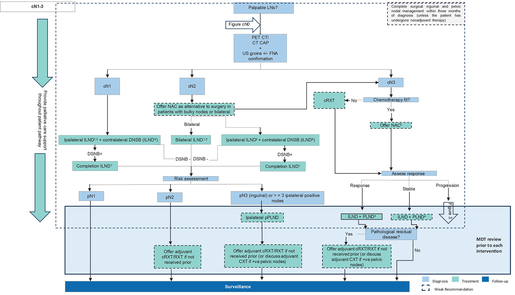 | Offer neoadjuvant chemotherapy (NAC) using a cisplatin- and taxane-based combination to chemotherapy-fit patients with pelvic lymph node involvement or those with extensive inguinal involvement (cN3) in preference to upfront surgery. (see Section 6.4.1). | Weak |