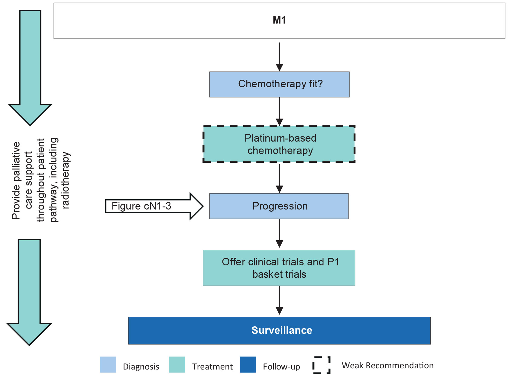 | Offer patients with distant metastatic disease platinum-based chemotherapy as the preferred approach to first-line palliative systemic therapy. | Weak |