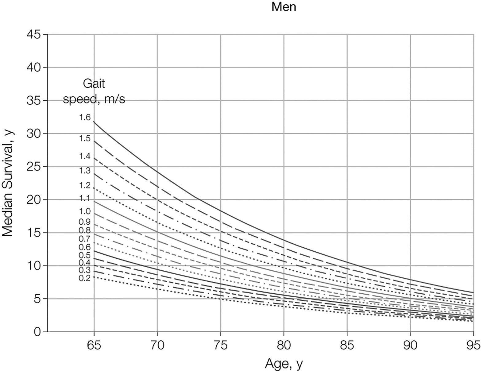 Figure 6.1: Predicted median life expectancy by age and gait speed for males* [569]