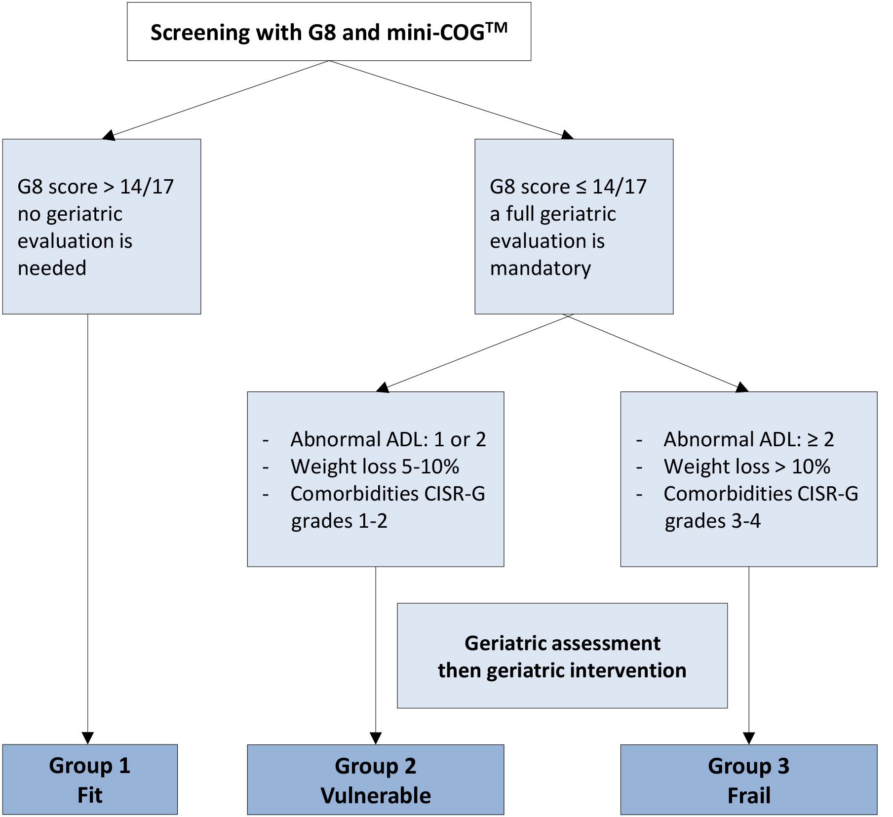 ADLs = activities of daily living; CGA = comprehensive geriatric assessment; CIRS-G = Cumulative Illness Rating Score - Geriatrics; Mini-COGTM = Mini-COGTM cognitive test.