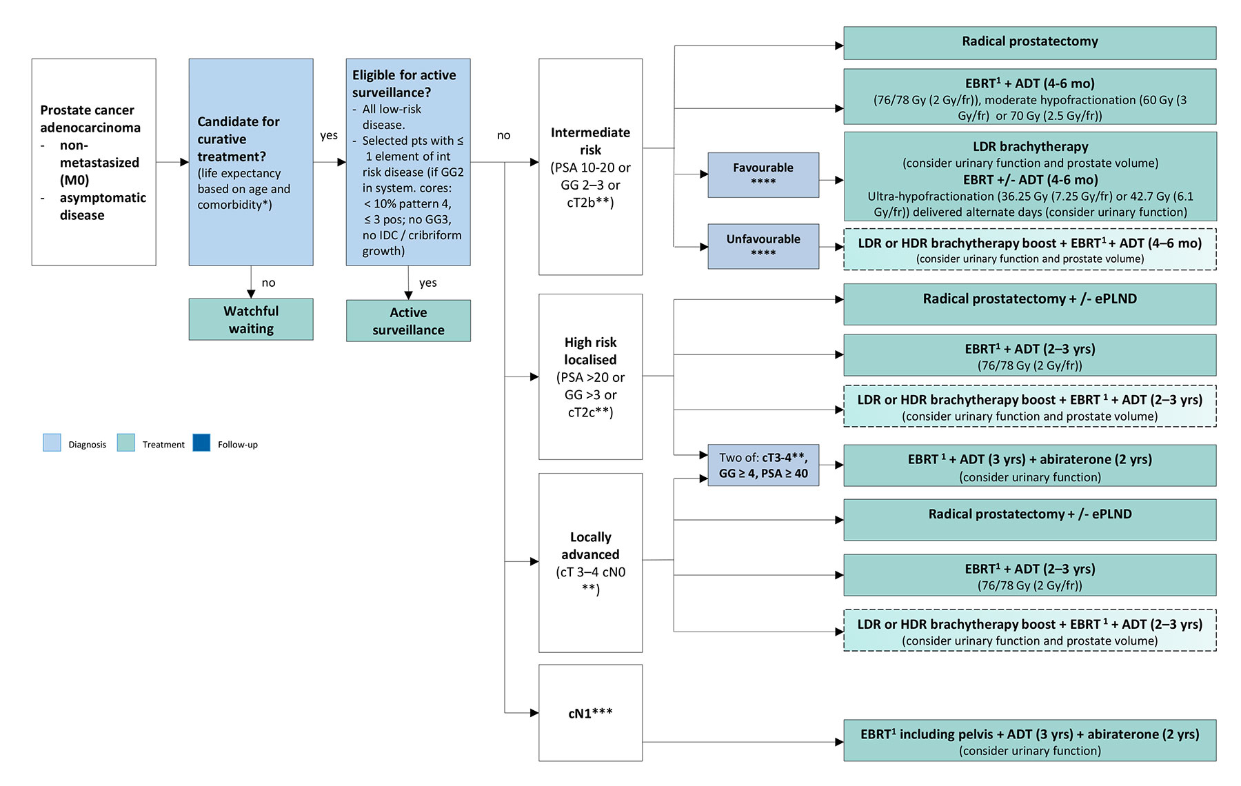 ADT = androgen deprivation therapy; CT = computed tomography; DRE = digital rectal examination; EBRT = external beam radiotherapy; ECE = extracapsular extension; ePLND = extended pelvic lymph node dissection; GG = grade group; HDR = high-dose rate; IDC = intraducal carcinoma; IGRT = image-guided radiotherapy; IMRT = intensity-modulated radiotherapy; LDR = low-dose rate; PSA = prostate-specific antigen; VMAT = volumetric modulated arc therapy.