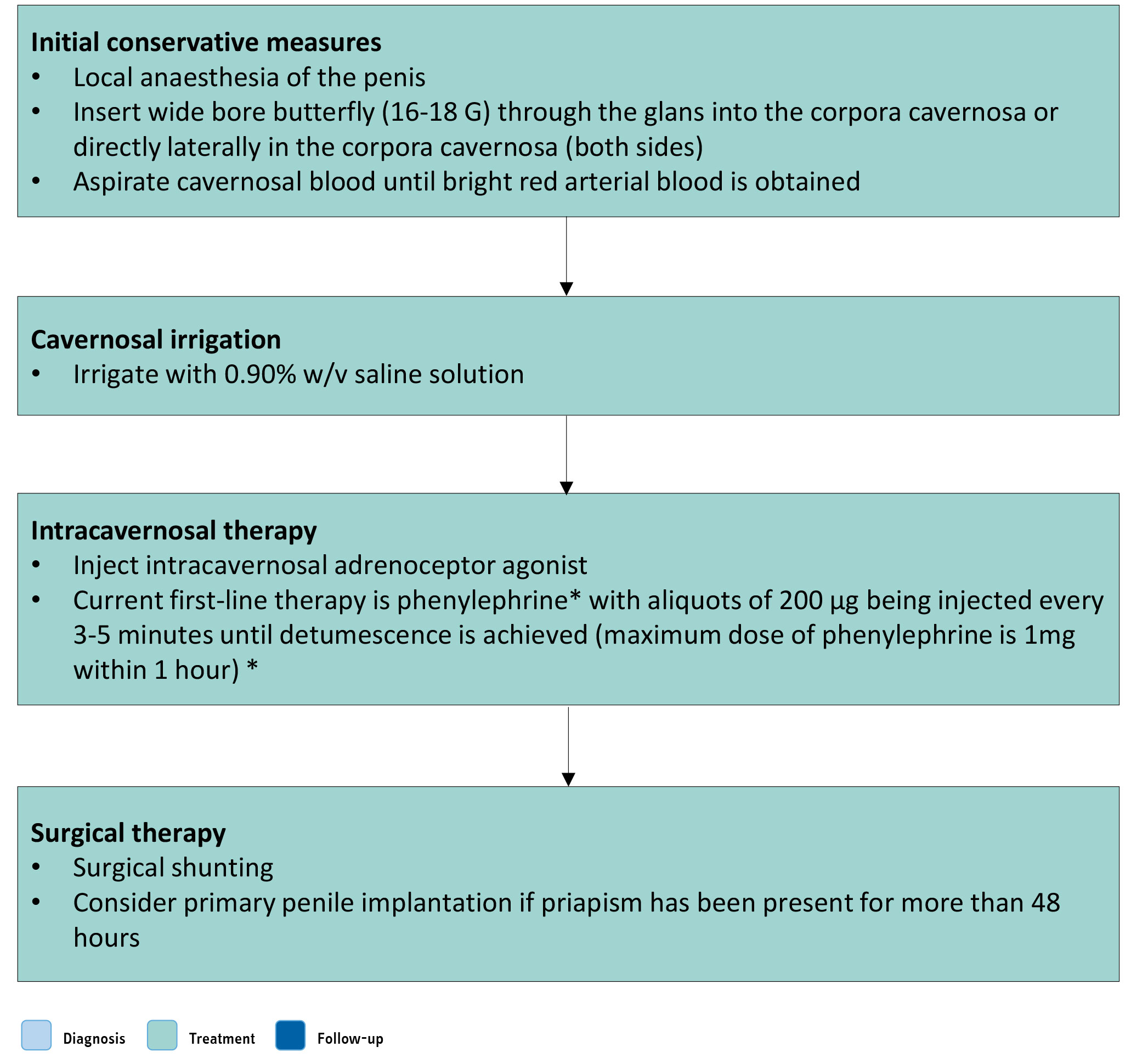 Several case series have reported outcomes for first-line treatments. In most cases, aspiration and irrigation were combined with intracavernosal injection of sympathomimetic agents [1393], thus making it difficult to draw conclusions about the success rate of aspiration plus irrigation alone [1393]. Overall, case series and retrospective studies reported a success rate ranging from 0 to 100% of cases [1393]. In an RCT, 70 patients with ischaemic priapism lasting more than six hours, secondary to intracavernosal injection and were treated with aspiration plus saline irrigation at different temperatures [1434]. The study reported an 85% success rate, with the optimum results achieved using a 10°C saline infusion after blood aspiration.