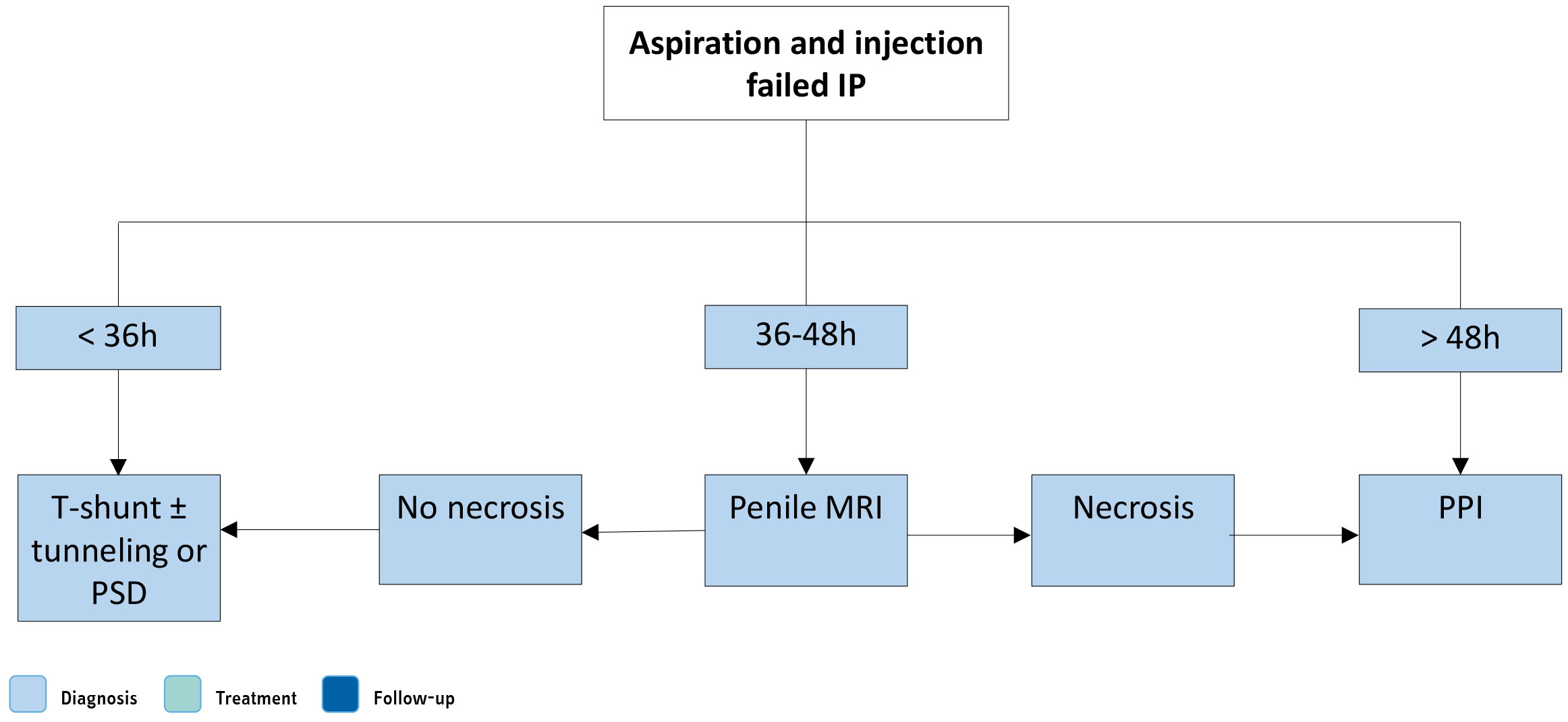 | Perform colour duplex ultrasound of the penis and perineum before aspiration to differentiate between ischaemic and non-ischaemic priapism. | Strong |