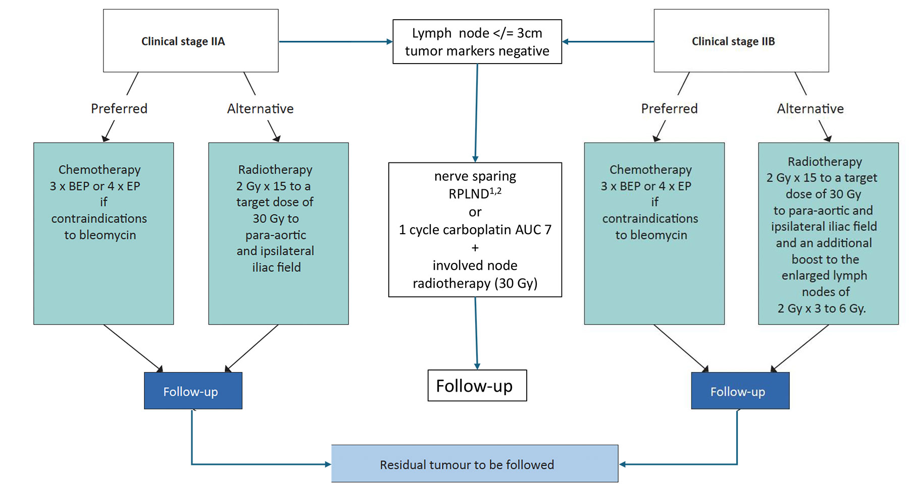 Radiotherapy to the ipsilateral retroperitoneal and common iliac field with a cumulative dose of 20Gy should be reserved for a highly selected group of patients, who are unsuitable for systemic chemotherapy in general, including adjuvant carboplatin or cisplatin-based combinations for relapsed disease. Importantly, RT carries a long-term risk of non-germ cell malignancies within the radiation field [109-112]. Generally, adjuvant RT should be avoided, particularly in young patients with a long life expectancy.