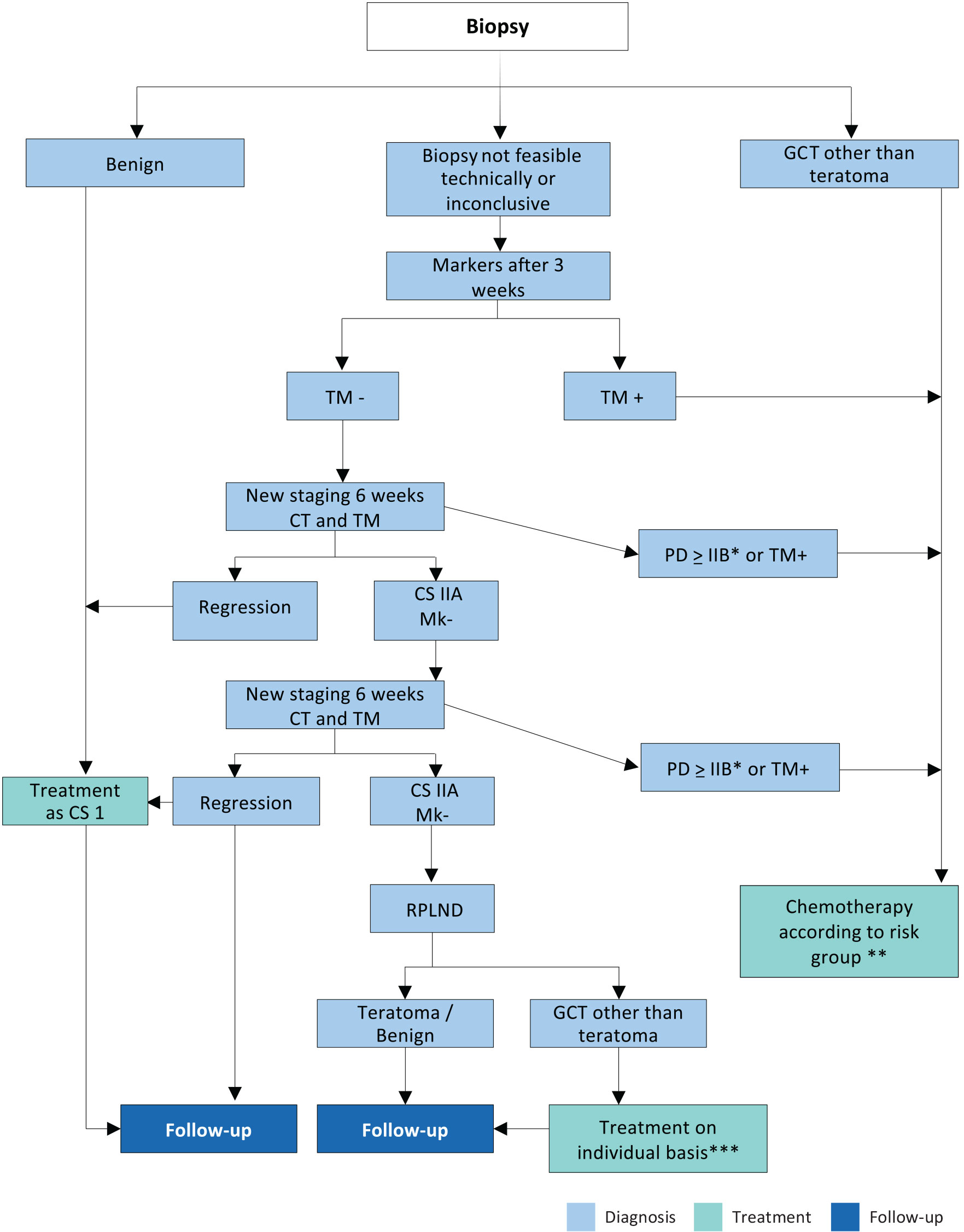 With elevated markers and CS I, weekly measurement of markers is recommended. If AFP or hCG increase or fail to normalise following orchidectomy, US examination of the contralateral testicle must be performed. If a contralateral tumour is excluded, unequivocal elevated tumour markers indicate micrometastatic disease, and treatment for metastatic GCT per IGCCCG prognostic group should be given.