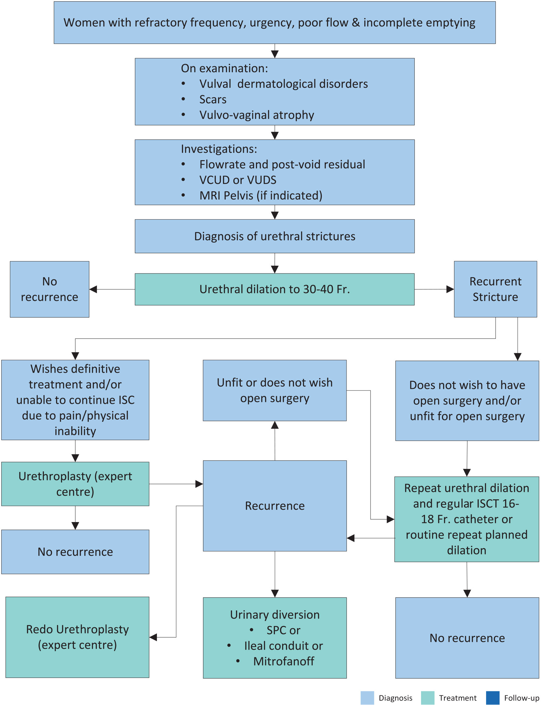 | Perform repeat urethral dilatation and start planned weekly intermittent self-dilatation (ISD) with a 16–18Fr catheter for the first recurrence of FUS or plan repeat dilatation. | Weak |