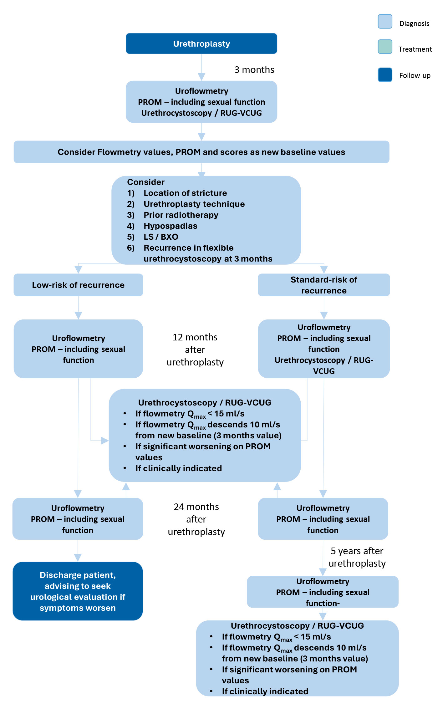* Follow-up could be discontinued after five years, advising the patient to seek urological evaluation if symptoms worsen. A longer follow-up period should be considered after penile and substitution urethroplasties. Academic centres could increase the length of follow-up for research purposes.