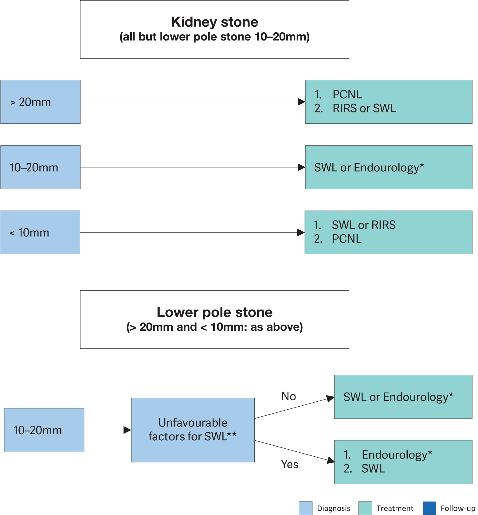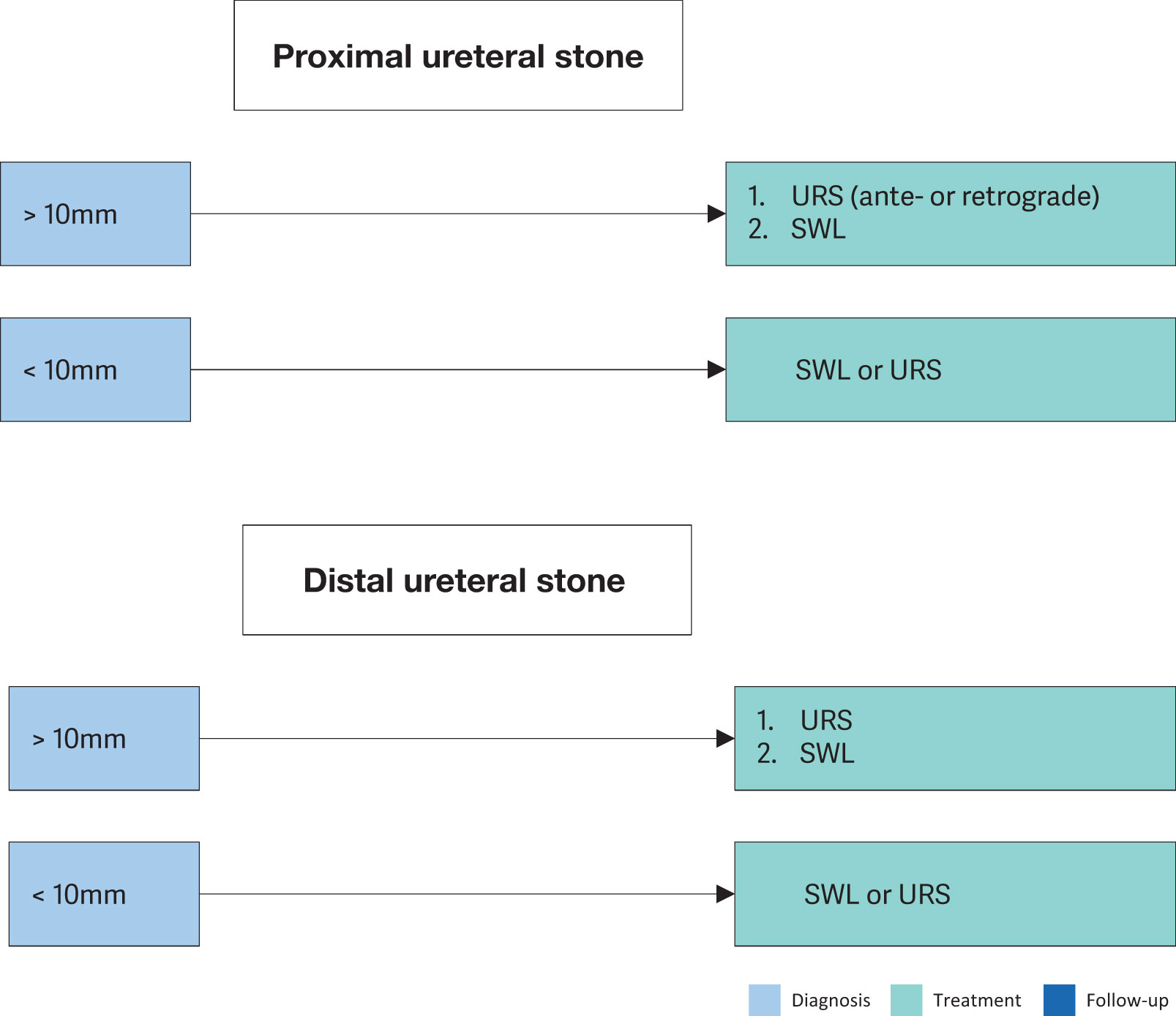 | Offer children with single ureteral stones less than 10mm shock wave lithotripsy (SWL) if localisation is possible or ureteroscopy as first-line option. | Strong |