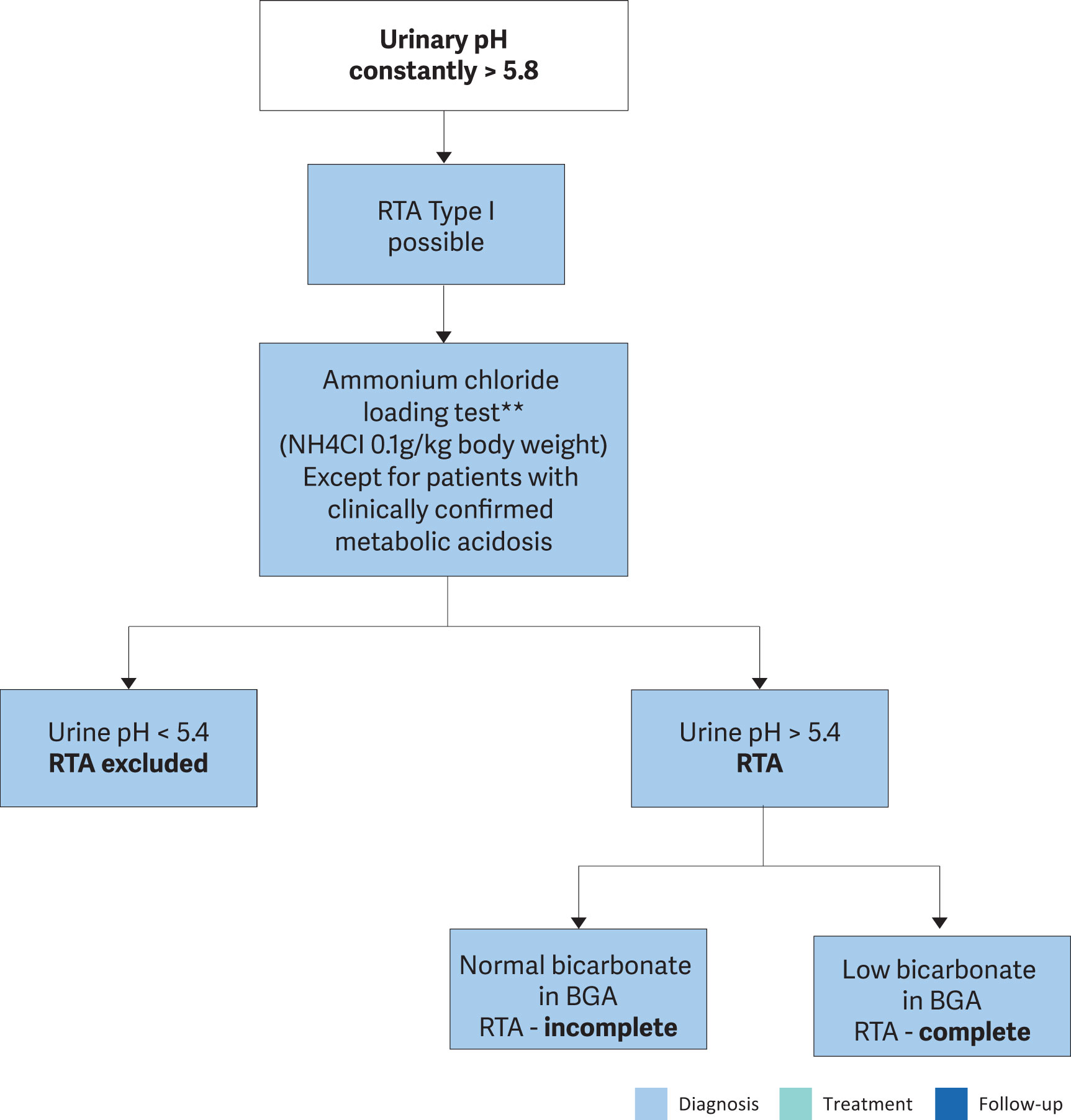 Urinalysis is performed routinely with a dipstick test as described above. A urine culture is required if there are signs of infection. Urine pH < 5.5 in 24-hour urine collection indicates hyperacidic urine, which could promote uric acid crystallisation. Urine pH > 6.2 in 24-hour urine collection may indicate RTA if UTI is excluded [738,740].