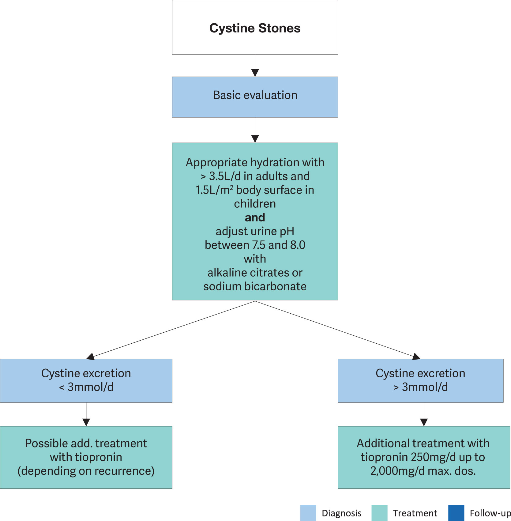Complex formation with cystine For patients with cystine excretion, > 3mmol/day, or when other measures are insufficient: prescribe in addition to other measures tiopronin, 250–2,000mg/day. | Strong |