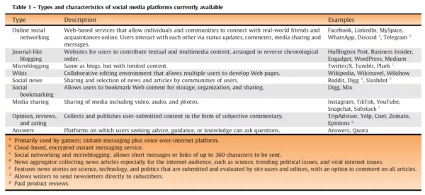 There are nine types of SoMe platform, each serving different purposes and functionalities (Table 1) [2]. An understanding of the appropriate platform according to the aim of SoMe use ensures effective communication and audience engagement in all professional contexts.
