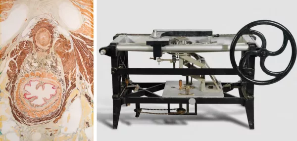 In the uro-anatomical laboratory, Gil Vernet used the histological-topographical method of the German anatomist and neurologist Otto Kalischer (1869-1942) with a giant Sartorius-Werke microtome. For each specimen, whether foetal or adult, he obtained about 200 frozen sections with a thickness of between 20 and 50 microns and dimensions of between 9 and 12 centimetres. The sections were stained with haematoxylin-eosin, and sometimes using van Gieson and Gallego trichrome or Bielschowsky's silver impregnation.