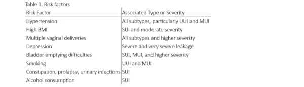 The identification of modifiable risk factors such as hypertension, smoking, overweight and depression has major clinical implications. Hypertension emerged as a strong predictor, particularly for urgency and mixed incontinence, suggesting that vascular dysfunction may contribute to detrusor instability.
