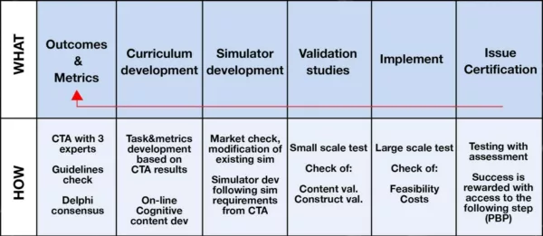 This is the most stimulating part of the process, as it allows to check and test all the devices that are useful to the designed tasks. In a first phase a test of the pertaining simulators on the market is needed. This is critical to highlight their pro’s and cons, to check the feasibility of the task on each of them and the possible upgrades or modifications to apply. Tests are usually run by a cohort of experts, after receiving in advance a detailed task description. If a simulator can be used with minimal modifications, then it’s usually preferred to a brand-new product design, which may require some dedicated investment. In case no system is fulfilling the requirements, then a new simulator is designed. Simulator development requires a close collaboration of educators, engineers and physicians.